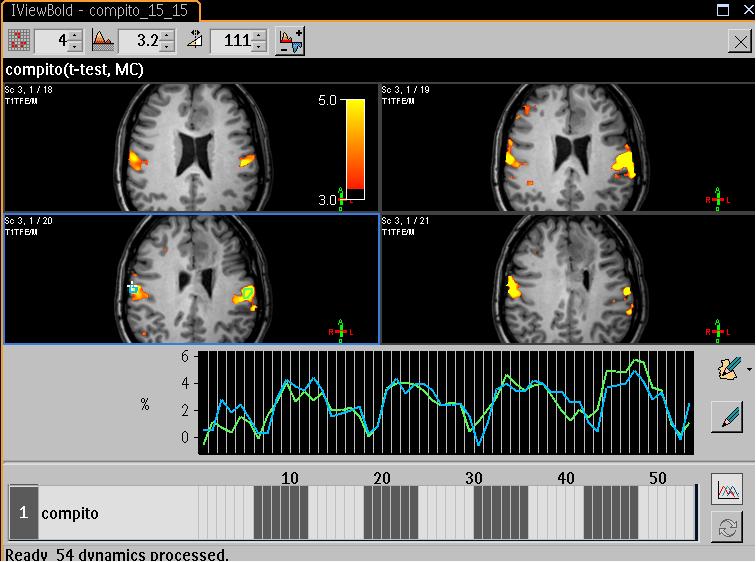 Le aree che "si accendono in giallo" sono le zone che si attivano quando viene svolto questo compito, disegnando due ROI (verde e blu) si evidenziano dei picchi che dimostrano l'attività della zona corticale di destra o sinistra alternativamente.